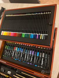 Valigetta in legno con pastelli colorati, pittura acrilica, pennarelli e pastelli a cera. 184 pezzi.