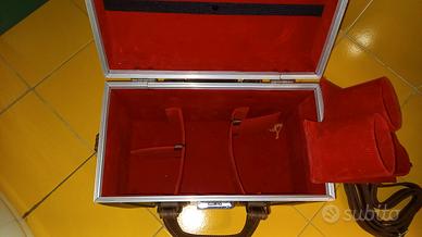 bauletto o valigetta vintage per attrezzatura fotografica, realizzato in finta pelle marrone con dettagli in metallo argentato.