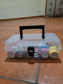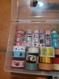 Valigetta di plastica dura trasparente con all'interno una grande varietà di washi tape.
