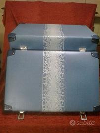 Valigia di cartone rinforzato e plastica a forma di parallelepipedo rettangolo. In ottime condizioni esterne ed interne. Con maniglia di plastica e di colore blu. Gli angoli esterni sono rinforzati con fermi angolari di plastica colore blu. Le chiusure e i ganci sono di metallo e perfettamente funzionanti