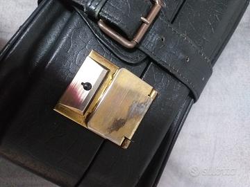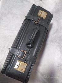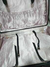 Semi rigida , esterno in ottimo stato visto la sua età, colore nero, chiusura con 2 serrature purtroppo senza chiave, e 2 cinture. Interno in raso rosa con qualche macchia, tasca con elastico sulla parte alta e 2 cinturini ferma vestiti sul fondo. Misure 60x40x20