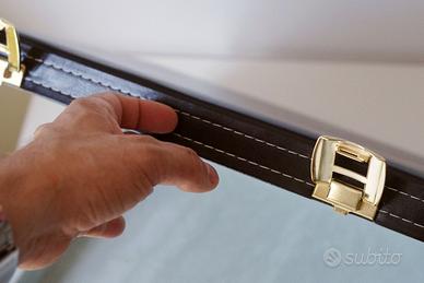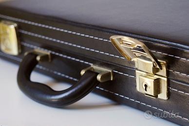 Splendida valigia in similpelle nera, nuova rimanenza di magazzino, produzione 2022 da azienda artigiana italiana, serrature dorate (chiave non fornita), interno foderato grigio con tessuto soffice tipo nabuk, solida e capiente, ideale per album di fotografie, raccolta monete, francobolli, soldatini, carte, memorabilia o altre collezioni, o magari per custodire documenti e articoli di pregio. Le misure interne sono:
