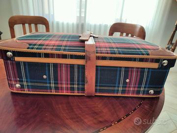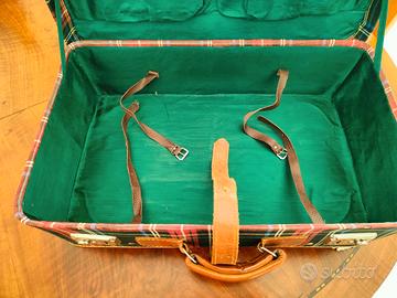 Bella valigia Vintage anni '60 ricoperta in tessuto a motivo scozzese, cinghia originale esterna e cinghiette interne in cuoio.