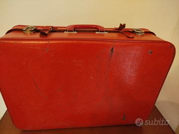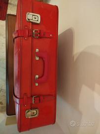 Splendida valigia vintage di un rosso vivace, risalente agli anni '60/'70. Un pezzo di carattere, ideale sia per collezionisti che come complemento d'arredo unico (perfetta come contenitore ai piedi del letto, porta-riviste o per vetrine scenografiche). Caratteristiche principali: Materiali: Rivestimento in vera pelle su struttura in cartone rigido rinforzato. Condizioni esterne: Presenta i classici e affascinanti segni del tempo che ne testimoniano l'autenticità e il vissuto (patina vintage). Condizioni interne: ottime, Il rivestimento interno è originale, integro con i normali segni di usura. Un dettaglio raro per oggetti di questa epoca. Dettagli: Cinghie esterne originali e serrature in metallo. Lo stato è ben visibile in foto. Dimensioni: Larghezza: 65 cm Altezza: 47 cm Profondità: 20 cm Un oggetto solido e di grande impatto visivo. Disponibile per spedizione accurata o ritiro a mano.
