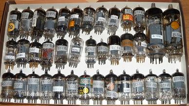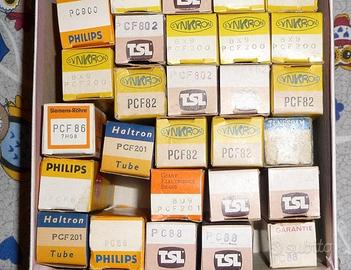 Valvole termoioniche nuove con scatola serie ecf-pcf-el-pl-ey-py-eabc-pabc anche serie nera 12sk7-12sq7-12sa7 ed americane vedi lista per tv e radio. Disponibili anche usate tra cui occhi magici em87 poi we20-we33-ef9 prezzo da concordare. Chiedere disponibilità.