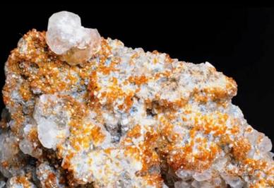 Questo campione si distingue per il suggestivo contrasto cromatico tra i micro-cristalli di vanadinite, dal caratteristico colore arancio intenso/esagonale, e la base di calcite bianca/traslucida che ne esalta la lucentezza.