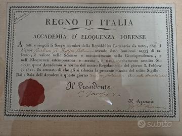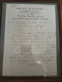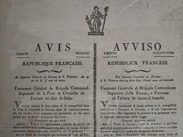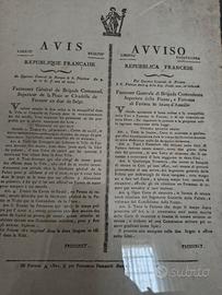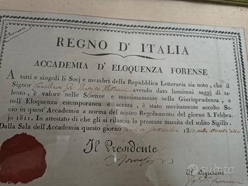 Vari documenti d'epoca, di cui: 1 bando di avviso bilingue del 1801, 200e + 1 attestato Accademia d'eloquenza forense del 1812, 150e + bando dipartimento del basso Po del 1813, 150e. Non spedisco.