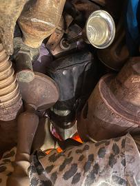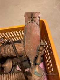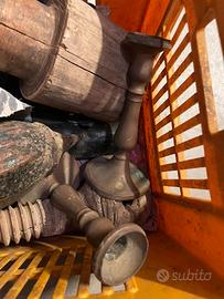 Portafiori ottenuti da bossoli in ottone, 2 portacandela in ottone, vecchi catenacci. Marsuppio per attezzi moto in pelle, porta preda per falce in legno, aplique in vetro quadrata. ecc.