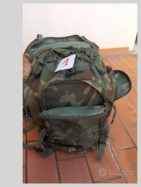 N°1 Zaino Militare, Woodland, Cordura sintetica,molte tasche esterne, separatori interni collegati tra loro con cerniere, per trasformare in un unico spazio centrale. molto ampio. Usato ma ottime condizioni tranne che per la rete sulla tasca esterna, che è stata ricucita, €30