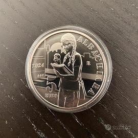 Rovescio: In primo piano, giovane ragazza ritratta con in mano dei libri mentre mangia una mela. A destra, ad arco, la scritta “ALBACHIARA” e “R”, identificativo della Zecca di Roma; a sinistra “2024”, anno di emissione della moneta, e il valore, “5 EURO”.