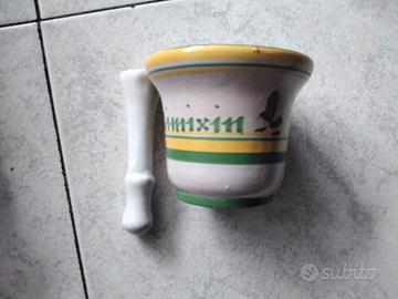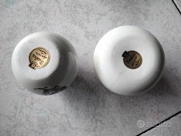 Coppia vasetti Maiolica, dipinti a mano, altezza 5,5cm e 8cm. (15cm). Mortaio in ceramica, altezza 8cm, (10 euro).
