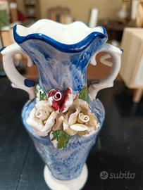 Piccolo vaso in ceramica decorativo vintage, caratterizzato da un motivo in rilievo, manici ad ansa e decorazioni floreali tridimensionali. Ceramica con finitura smaltata