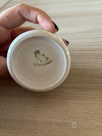 Piccolo vasetto in porcellana di Capodimonte, con fiori, il coperchio presenta una piccola sbeccatura come riportato in foto, misure diametro 5 cm e altezza 5 cm, da collezione. Prezzo 12€ che tiene conto anche del piccolo difetto presente.