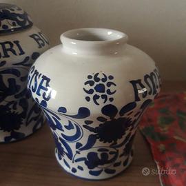 Vasi in ceramica smaltata e pubblicitaria con scritta e finiture a mano "Amarena Fabbri Bologna", Manifattura: LG/ LA FRANCESCANA di Gualdo Tadino Entrambi i manufatti riportano il timbro smaltato LG della ceramica con firma (Rino - forse, vedi foto) Materiale: ceramica Dimensioni: N.B. (piccola senza coperchio) Ø massimo cm 13 - h. cm 14; Grande con coperchio larghezza cm.14 e altezza cm.17. Epoca: anni 1960 - 1970. Non hanno sbeccature. integri e perfetti. Il prezzo è per il singolo pezzo. Se ritirati entrambi congruo sconto