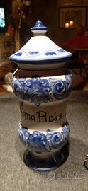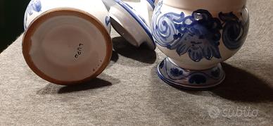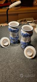 Disponibili in coppia : 2 vasi retro' di farmacia - ceramiche e lavorazione di Az.Ceramiche di Montelupo Fiorentino ( FI ) - entrambi con chiusura posteriore- sono in ceramica smaltata blu e bianca rappresentanti ornamenti floreali - Misura di ognuno : h25xla10 - ottimo stato di conservazione ( un coperchio presenta segni di vecchie sfogliature) - prezzo rsposto e' riferito alla vendita dei 2 articoli -