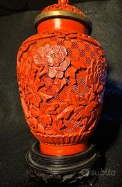 Si accettano offerte per coppia di vasi cinesi antichi con coperchio in lacca di cinabro, colore esterno rosso, interno blu cobalto, bordo con finitura in ottone; piccolo piedistallo in legno lavorato. Sono rappresentati fiori e motivi ornamentali.