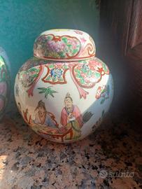 Coppia di vasi orientali cinesi vintage, in ceramica, impreziositi da raffigurazioni di gheise cinesi e fiori, di notevole impatto scenografico, grazie anche ai dettagli realizzati con accuratezza e raffinatezza. Dimensioni: 16 cm. e 13 cm. vendibili anche singolarmente. Il prezzo indicato è cad. uno