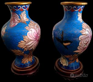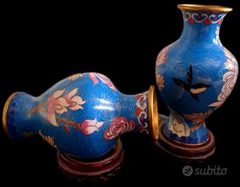 VASI CINESI CLOISONNE Decoro fiori Con Base In Legno. Anni 70, perfette condizioni