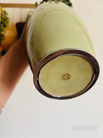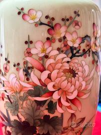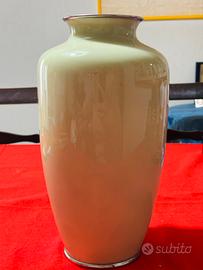 Splendido vaso vintage originale giapponese realizzato con la tecnica del "Ando Cloisonné" (smalto alveolato). Il vaso è finemente decorato a mano con motivi floreali classici: crisantemi e rami di ciliegio (sakura), simboli di longevità e bellezza nella cultura nipponica. La lavorazione è di alta precisione, con sottili fili metallici che separano le delicate sfumature di colore dello smalto. • Periodo: Periodo Showa (metà XX secolo). • Condizioni: Ottime condizioni vintage. Lo smalto è lucido, non presenta crepe o sbeccature evidenti. I bordi metallici presentano una naturale patina del tempo che ne attesta l'autenticità. • Dettagli: Presente marchio di fabbrica sulla base (possibile manifattura Ando o scuola di Nagoya).Altezza 21cm diametro base cca 8cm NB Oggetti simili della manifattura Ando, di queste dimensioni e in questo stato di conservazione, si trovano nelle gallerie d'antiquariato o nei negozi vintage specializzati a prezzi compresi tra 400€ e 500€. Vendo a 250€ per realizzo immediato, un vero affare per collezionisti.(prezzo un può tratabile)