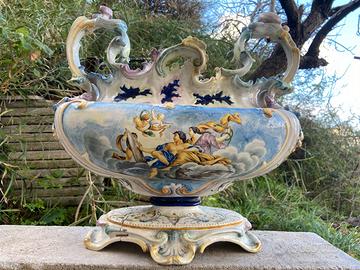 Vedo vaso/centrotavola decorato interamente a mano, in maioloca. L’ogetto in questione é datato fine 800’ primissimi del 900’ .
