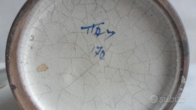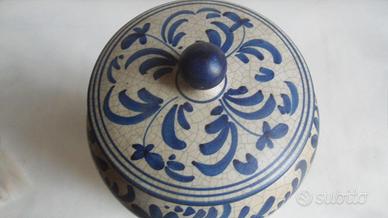 ANTICO VASO IN CERAMICA CON DISEGNO FLOREALE BIANCO E BLU CON PICCOLI DECORI ARANCIONI, CON CRAQUELE' ORIGINALE; CON MARCHIO sul FONDO. ALTEZZA CM. 35 (COPERCHIO INCLUSO), LARGHEZZA 16 CM.