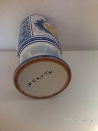 Vaso contenitore porta utensili da cucina o farmacia, ceramica dipinta a mano firmato Deruta con decorazioni Raffaellesche a colori vivaci, in perfette condizioni
