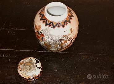Bellissimo vaso di ceramica con coperchio, dipinto a mano con dettagli in oro e bianco. Un pezzo elegante e raffinato per la tua casa.