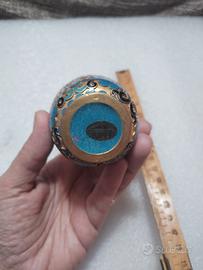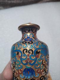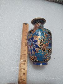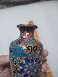 Splendido e piccolo vaso a forma di giara, realizzato con la tecnica del cloisonné, caratterizzato da ricchi e vivaci motivi floreali e a volute. I colori dominanti sono il blu, l'azzurro, il rosso e il nero, su fondo dorato, che creano un forte impatto visivo. Presenta una finitura dorata sull'orlo e sulla base. Ideale come pezzo da collezione, per decorazione da scrivania o in una vetrinetta di oggetti d'arte asiatica. La base reca l'etichetta "MADE IN CHINA". Perfetto per collezionisti o per un tocco di eleganza orientale.