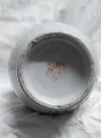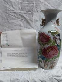 "Un vaso antico in porcellana decorato frontalmente con motivi floreali e un uccello, posteriormente caratteri in cinese. Il vaso dovrebbe essere stato prodotto intorno al 1900, sul fondo si trova un marchio incompleto. Le dimensioni sono altezza di circa 27 cm, diametro di circa 12 cm.