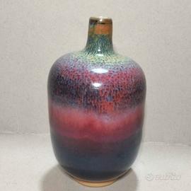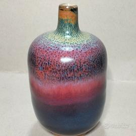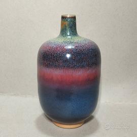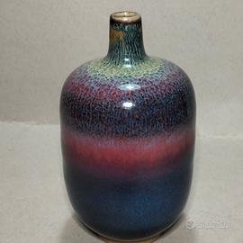 L'oggetto mostrato nell'immagine è un vaso firmato in ceramica artistica, caratterizzato da una particolare smaltatura sfumata tipico dello stile della porcellana Jun cinese della metà del secolo scorso. Questo stile è noto per le sue smaltature opulente con colori che vanno dal blu al viola e al rosso "sangue di bue". Vasi con forme a "bottiglia lanterna" presentano spesso queste transizioni cromatiche e finiture lucide o craquelé. Caratteristiche del Vaso Il vaso nell'immagine presenta: Forma: Corpo arrotondato e "panciuto" con un collo stretto, simile a una bottiglia o un vaso a goccia. Smalto: Una finitura lucida e iridescente che sfuma dal blu profondo alla base, passando per un rosso rubino/viola centrale, fino a toni verdastri e ocra verso l'alto. Vaso firmato del XX secolo. In eccellenti condizioni. Dimensioni: 14,5 x 8 CM 390 GR