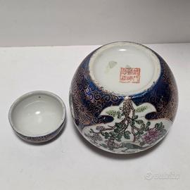 Vaso contenitore cinese smaltato e dipinto con scene naturali.