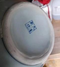 raffinato vaso a bottiglia in porcellana cinese, caratterizzato dalla classica combinazione cromatica bianco e blu sottosmalto. L'oggetto presenta una forma armoniosa con corpo globulare e collo slanciato che termina con un bordo svasato. Scena Centrale: La pancia del vaso è interamente decorata con una scena narrativa finemente dipinta, che ritrae figure orientali (probabilmente saggi o cortigiane) immerse in un paesaggio naturale con rocce, montagne e alberi di pino, simbolo di longevità. Motivi Ornamentali: La spalla è impreziosita da una bordura a "nuvole" o teste di ruyi, mentre il collo è decorato con motivi floreali e arborei che richiamano lo stile delle epoche Ming e Qing. Ottime condizioni estetiche senza crepe o sbeccature.