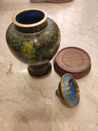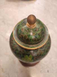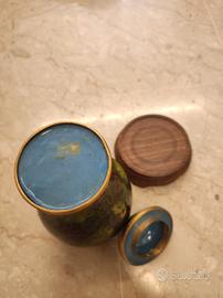 Vaso cinese smaltato cloisonne su base di legno, potiche con coperchio. 21 cm circa con base di legno