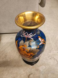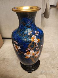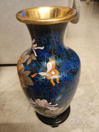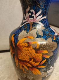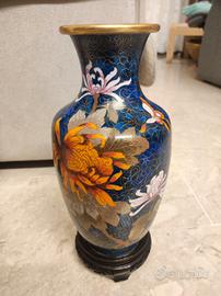 Meraviglioso vaso cinese smaltato cloisonne, con base di legno. Altezza 31 cm senza base.