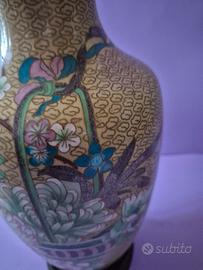 Bellissimo vaso Cloisonne' cinese motivi floreali policrome metà del secolo altezza cm. 36 con base in legno