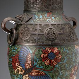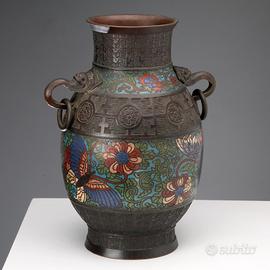 Vaso in bronzo decorato a fasce in smalti policromi con la tecnica del cloisonn di tipo shippo. La fascia superiore presenta un decoro a fiori e a girali fogliate, la fascia centrale fiori e farfalle. Anse con maschera e anello. Codice: OGANOG0303055 Condizione prodotto: Oggetto in buone condizioni, presenta piccoli segni di usura. Cerchiamo di presentare lo stato reale dell'oggetto nel modo pi completo possibile con le foto. Qualora alcuni particolari non risultassero chiari dalle foto, fa fede quanto riportato nella descrizione. Misure: Largh.:22.00 cm, Alt.:29.00 cm, Prof.:17.00 cm DISPONIBILE RITIRO, PREVIO SALDO, SU APPUNTAMENTO PRESSO LA SEDE DI MILANO! Venditore: Barbara (dal Luned al Venerd : dalle 9:00 alle 19:00, Sabato: dalle 10.00 alle 19.00) Per informazioni dettagliate contattateci su Whatsapp. Disponibili ad inviare video o foto integrative su Whatsapp. Di Mano in Mano, Negozio dell'usato di Milano, viale Espinasse, 99 (Zona Certosa). Oltre 1000 mq di esposizione, tra usato, vintage, modernariato, antiquariato, arte e libri. Esplora il nostro portale mercatiniusato.org per scoprire centinaia di arredi usati.