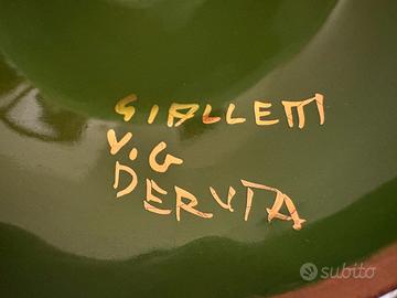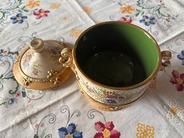 Vendo vaso / coppa decorativa con coperchio in ceramica artistica di Deruta, firmata Girelli, produzione vintage anni ’50–’70. Decorazione floreale policroma dipinta a mano, con ricche applicazioni dorate in rilievo e interno smaltato verde. Oggetto elegante e molto decorativo, tipico della tradizione ceramica umbra. Altezza: circa 20 cm Ottime condizioni generali, senza crepe o sbeccature, completo del suo coperchio originale.
