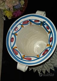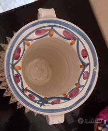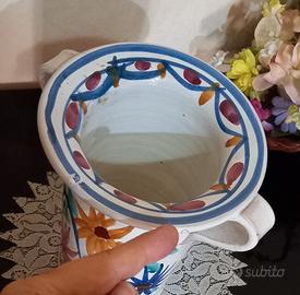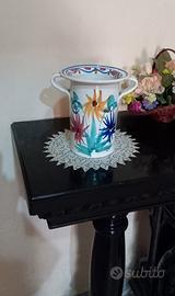 Vaso con manici molto bello motivi floreali margherite e decorazioni foto scattate con flash e senza flash mostrato con ingrandimento evidenziato, tutto e come da foto e descrizione, invisibili diversità della lavorazione e del tempo stesso, più segnalato in un foto micro scheggetta mancante, colori sul panna e multi, larghezza totale dai manici circa 19/ cm./ altezza circa 17. 4/ cm./ circa ,condizioni ben conservato, possibilità di ritiro a mano, spese di spedizione a parte l'imballaggio sarà adattato e curato.