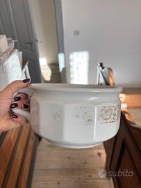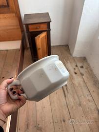 Vaso da notte originale d’epoca, realizzato in ceramica smaltata di colore bianco, con manico laterale e marchio sul fondo (visibile in foto).