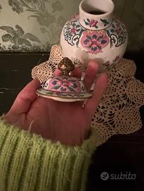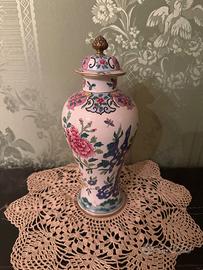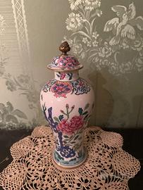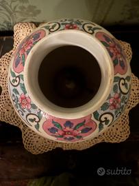 Vendo elegante vaso decorativo in ceramica smaltata con motivi floreali dipinti a mano, completo di coperchio con pomello in metallo.