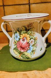 Prezioso vaso in ceramica di Castelli, decorato a mano con l'immagine del"fioraccio"in cui è presente tipicamente un bouquet di fiori campestri con una rosa centrale contornata da margherite di vari colori.Tipicamente a forma di"conca",con due manici laterali e stretto nella parte centrale. Veniva utilizzato dalle donne per prendere l'acqua dal pozzo per portarla nelle abitazioni. Funge da porta vasi da terra o da poggiare su mobili e mensole, si tratta di un pezzo unico, artigianale, Made in Italy, realizzato da famosi ceramisti del centro Italia della zona diCastelli.