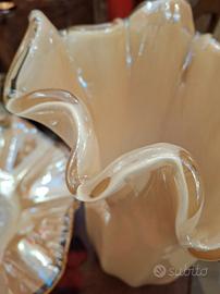 Incantevole centrotavola e vaso coordinato, realizzati in vetro artistico di Murano, caratterizzati da bordi a fazzoletto con finitura iridescente color miele dorato.