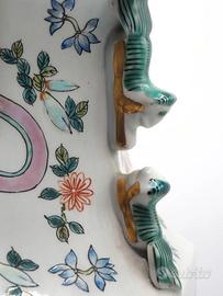 Vaso esagonale in porcellana decorata con anse plastiche Cina, XX secolo cm. 41x22x16 Elegante vaso in porcellana bianca di forma esagonale panciuta, con collo svasato e orlo piatto, su base esagonale piana non smaltata. Il pezzo si distingue per la presenza di due anse plastiche a forma di draghi (chilong) applicate ai lati del collo, smaltate in verde-turchese con dettagli dorati — elemento decorativo di pregio che richiama la produzione di manifattura di Jingdezhen destinata all’esposizione domestica. La decorazione è realizzata nella tradizione della famiglia rosa (fencai), con smalti policromi su fondo bianco, e si articola su più registri sovrapposti. Il pannello principale del corpo ospita una raffinata scena di corte con figure femminili — presumibilmente dame di palazzo o dee — in abiti tradizionali dalle tinte rosa, ocra e verde, ritratte entro una riserva mistilinea a volute rosa e turchese, con sullo sfondo un paravento architettonico laccato. La composizione richiama le iconografie tipiche delSogno della camera rossa(Hongloumeng), il celebre romanzo classico cinese ambientato tra le donne dell’aristocrazia. Il pannello secondario, visibile nella foto del fondo, presenta una scena con figure maschili in corteo su fondo verde celadon all’interno di una riserva analoga, con personaggi che recano ombrellini e offerte — possibile riferimento a scene di omaggio imperiale o processione rituale. Il collo reca riserve cartucciate con paesaggi lacustri in verde e blu, mentre la superficie esterna è disseminata di elementi floreali — peonie, crisantemi, loto e farfalle — distribuiti con leggerezza su fondo bianco. La fascia basale è decorata con motivi floreali stilizzati in turchese e rosa su fondo chiaro. Il fondo, non smaltato, mostra la tipica terracotta rossastra della manifattura di Jingdezhen, privo di marca visibile. Stato di conservazione:buono; lievi segni d’uso coerenti con l’epoca.