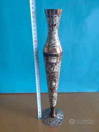 Vaso floreale turco vintage in rame inciso e decorato, nome tradizionale Curcan. Finemente ed elegantemente cesellato, offre tutta la sua bellezza nello slancio verso l'alto. Il vaso presenta una lavorazione artigianale dettagliata, con motivi floreali incisi a contrasto che ricoprono gran parte della superficie. Misure di riferimento in foto. Le foto descrivono esattamente il vaso e sono parte integrante della descrizione. Visita il mio profilo per altri vasi orientali e non solo.