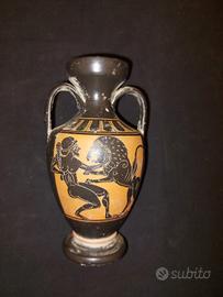 Anfora attica a figure nere, un tipo di vaso greco antico caratterizzato da figure dipinte in silhouette nera su uno sfondo di argilla chiara. La scena centrale raffigura l'eroe grecoEracle(Ercole per i Romani) impegnato nella sua prima fatica: la lotta contro ilLeone di Nemea.