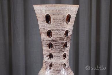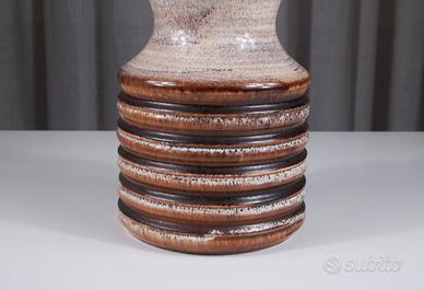 🏺 Questo imponente vaso rappresenta un'eccellenza della ceramica tedesca della metà del secolo scorso. La Walter Gerhards KG fu fondata nel 1957 a Höhr-Grenzhausen, il cuore pulsante della regione del Westerwald nota per la produzione ceramica. A differenza di molti concorrenti dell'epoca, l'azienda si distinse per una produzione semi-artigianale di altissima qualità, mantenendo un controllo stilistico rigoroso che rendeva ogni pezzo quasi scultoreo. 🎨 Estetica e Dettagli Tecnici Il modello 455-45 è un esempio magistrale dello stile Fat Lava, caratterizzato da smalti spessi e texture materiche. Con un'altezza di ben 45 cm, il vaso presenta una silhouette slanciata e complessa: Base cilindrica con profondi solchi orizzontali in tonalità bruno-terra. Corpo centrale con una texture puntinata e "occhi" incavati che creano un gioco di luci e ombre unico. Smaltatura che sfuma dal crema al marrone profondo, tipica della sperimentazione chimica degli anni '60. 📜 Un Pezzo da Collezione Il marchio sul fondo riporta il numero di serie e la provenienza West Germany. Gli oggetti firmati Gerhards sono oggi molto ricercati dai collezionisti per la loro robustezza estetica e per la capacità di arredare ambienti sia vintage che contemporanei. La particolarità di questo modello risiede nella sua presenza scenica, capace di diventare il punto focale di una stanza. 💎 Condizioni L'oggetto si presenta in eccellenti condizioni, mantenendo intatta la lucentezza degli smalti originali e la definizione dei rilievi, senza crepe o restauri.