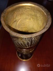 vaso in ottone contorto ricavato da bossolo di cannone da 105mm della seconda guerra mondiale risalente all'anno 1940. Oggetto rappresentativo dell'arte da trincea espressione della "TRENCH ART" con dettagli intricati martellati a mano raffiguranti simbologia del lavoro.