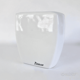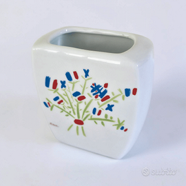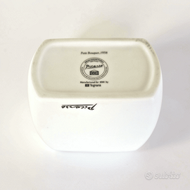 Questo vaso appartiene alla prestigiosa linea di oggettistica d'arte prodotta dall'italiana Tognana su licenza della Succession Picasso e di Museum Masters International (MMI). Soggetto: Riproduce la litografia a colori "Bouquet de Fleurs" (spesso commercializzata come "Petit Bouquet") del 21 aprile 1958. L'opera raffigura un mazzo di fiori stilizzati Caratteristiche: Realizzato in porcellana bianca con stampa serigrafica ad alta fedeltà che riproduce i colori primari (giallo, rosso, blu e verde). Autenticità: Reca la firma a stampa "Picasso" e la data "1958" sul lato; il fondo riporta il marchio Tognana, il logo MMI e la dicitura della licenza ufficiale.