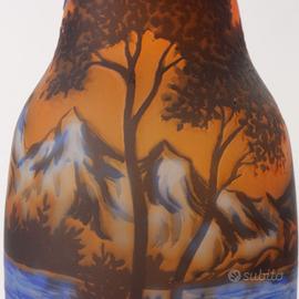 Vaso in vetro policromo decorato con paesaggio a tutto campo. Vaso ottenuto