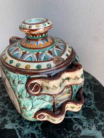 Vaso in terracotta, dipinto a mano e con decorazioni policrome. Altezza 20cm Diametro 13cm